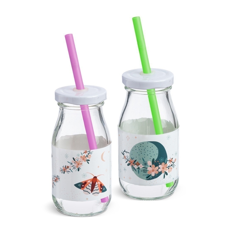 Γυάλινο μπουκάλι γάλακτος 200ml με λευκό μεταλλικό καπάκι. Συνοδεύεται από πολύχρωμα καλαμάκια. Είναι διακοσμημένο με αυτοκόλλητο print πεταλούδες .