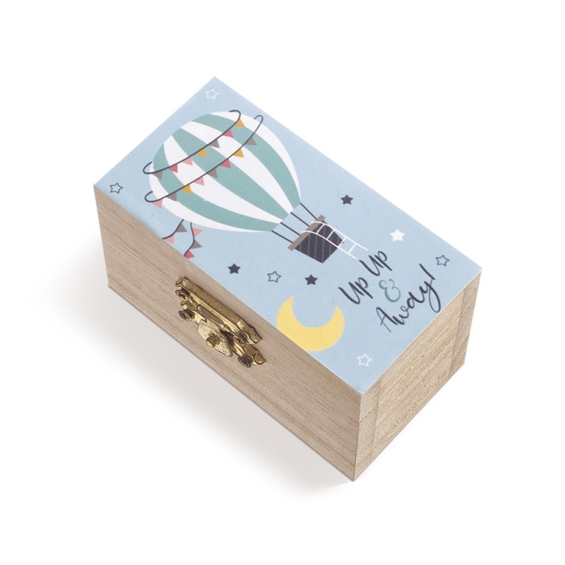 Ξύλινο natural σεντούκι με μεταλλικό κούμπωμα. Είναι διακοσμημένο με αυτοκόλλητο print αερόστατο σιέλ.
