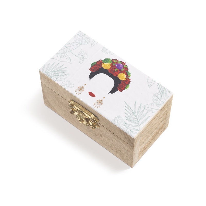Ξύλινο natural σεντούκι με μεταλλικό κούμπωμα. Είναι διακοσμημένο με αυτοκόλλητο print Frida Kahlo.