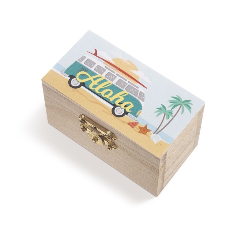 Ξύλινο natural σεντούκι με μεταλλικό κούμπωμα. Είναι διακοσμημένο με αυτοκόλλητο print aloha.