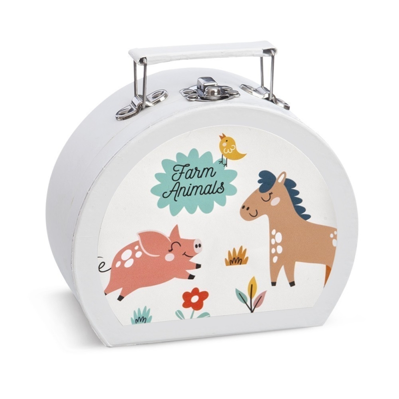 Χάρτινο οβάλ βαλιτσάκι σε natural/φυσικό χρώμα με μεταλλικό κούμπωμα. Είναι διακοσμημένο με αυτοκόλλητο ζωάκια της φάρμας με πουλάκι.