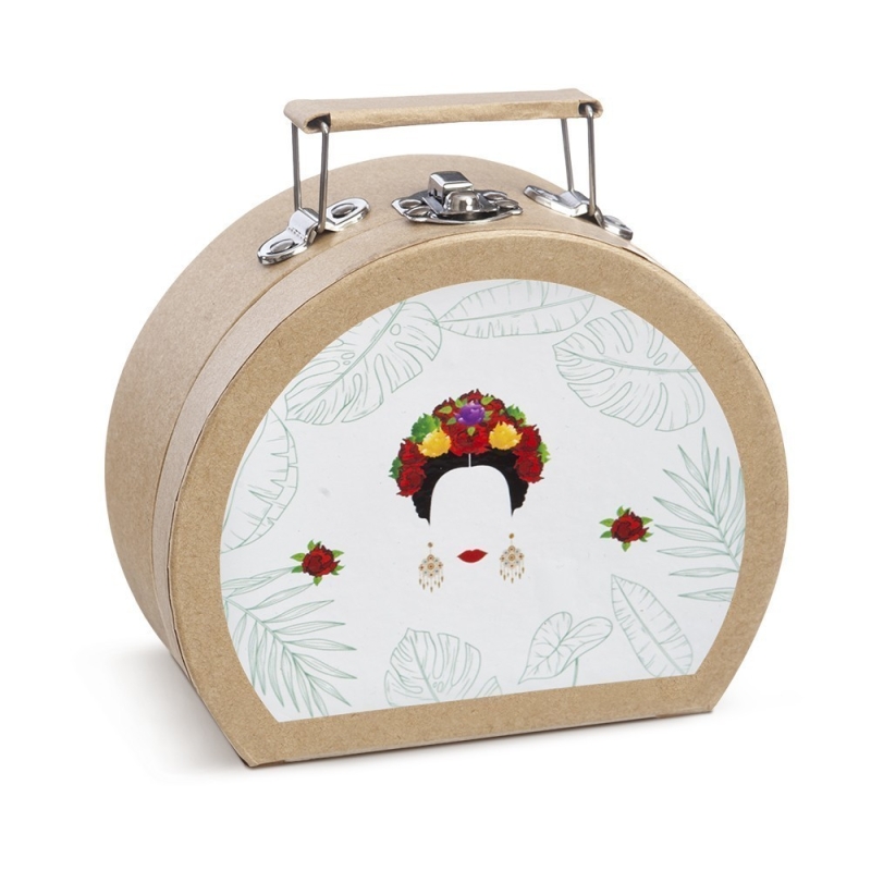 Χάρτινο οβάλ βαλιτσάκι σε natural/φυσικό χρώμα με μεταλλικό κούμπωμα. Είναι διακοσμημένο με αυτοκόλλητο Frida Kahlo.