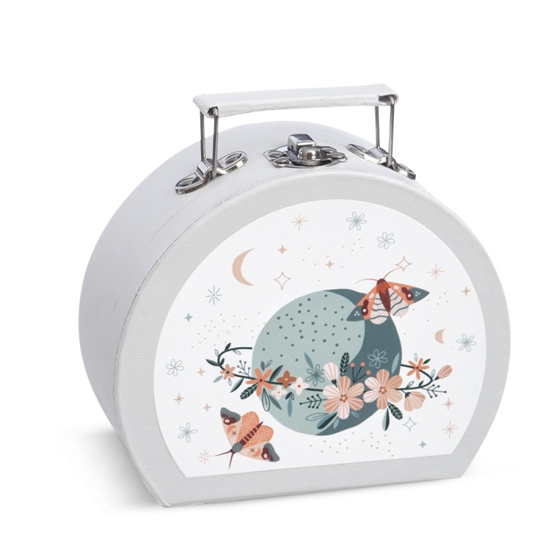 Χάρτινο οβάλ βαλιτσάκι σε natural/φυσικό χρώμα με μεταλλικό κούμπωμα. Είναι διακοσμημένο με αυτοκόλλητο πεταλούδες.