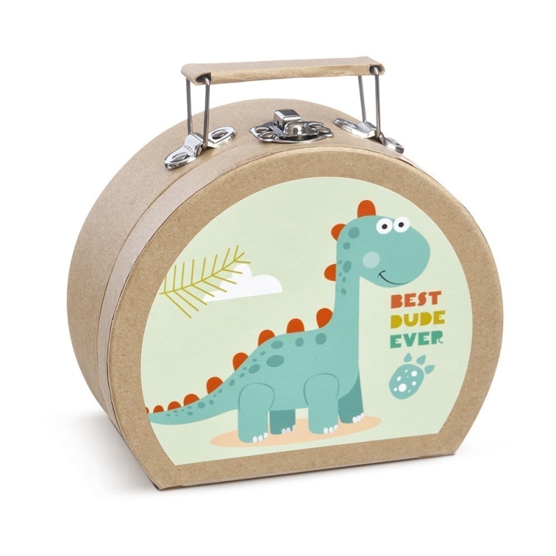 Χάρτινο οβάλ βαλιτσάκι σε natural/φυσικό χρώμα με μεταλλικό κούμπωμα. Είναι διακοσμημένο με αυτοκόλλητο δεινόσαυρος βεραμάν.