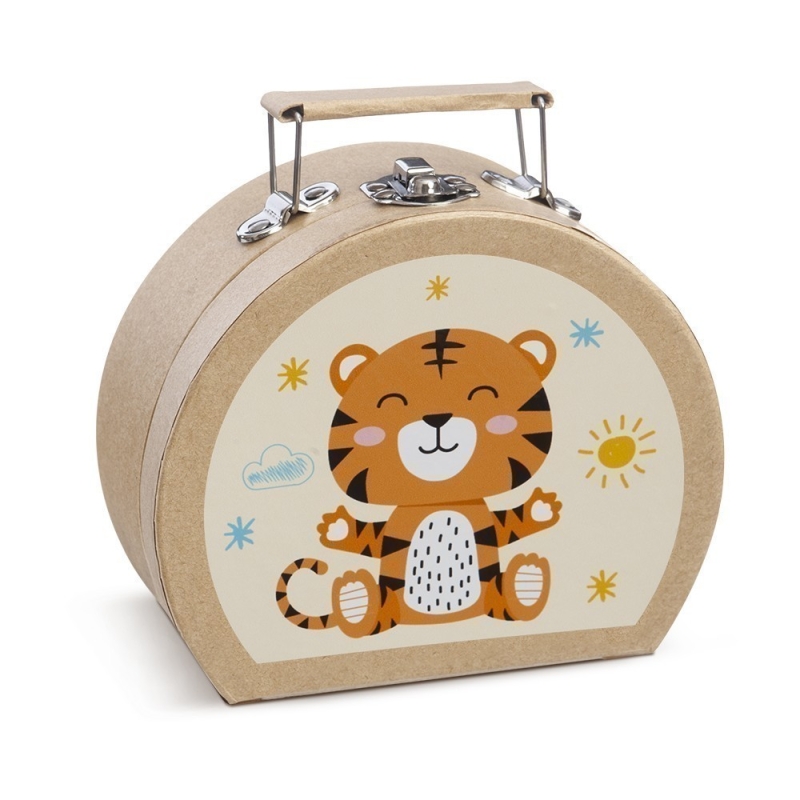 Χάρτινο οβάλ βαλιτσάκι σε natural/φυσικό χρώμα με μεταλλικό κούμπωμα. Είναι διακοσμημένο με αυτοκόλλητο τιγράκι.