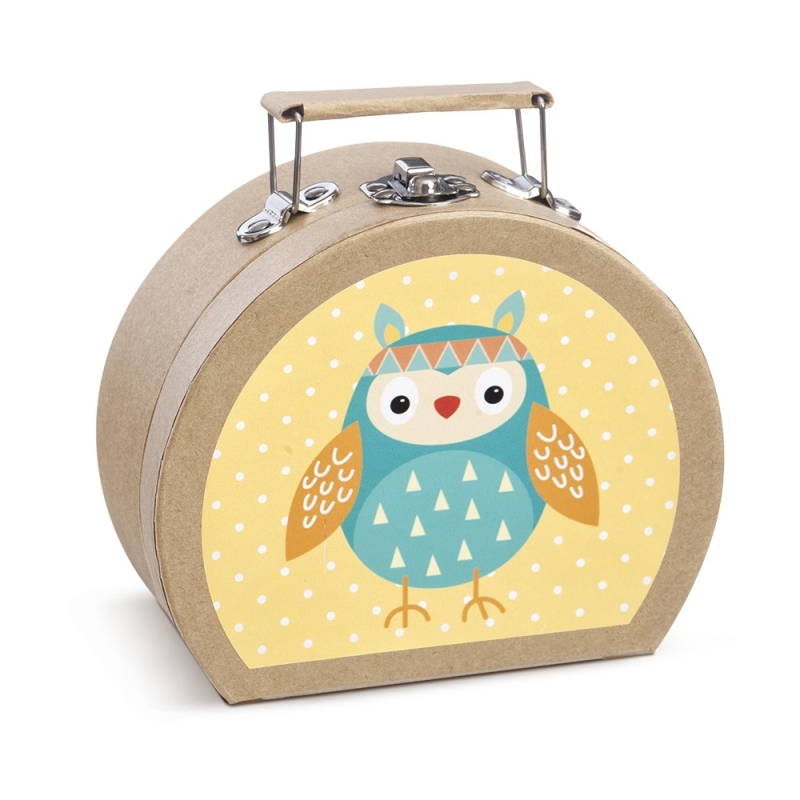 Χάρτινο οβάλ βαλιτσάκι σε natural/φυσικό χρώμα με μεταλλικό κούμπωμα. Είναι διακοσμημένο με αυτοκόλλητο κουκουβάγια σε πορτοκαλί απόχρωση.