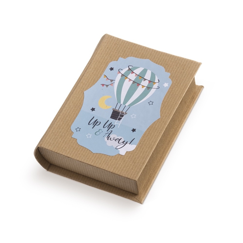 Χάρτινο kraft βιβλιαράκι. Είναι διακοσμημένο με αυτοκόλλητο αερόστατο σε σιέλ απόχρωση.