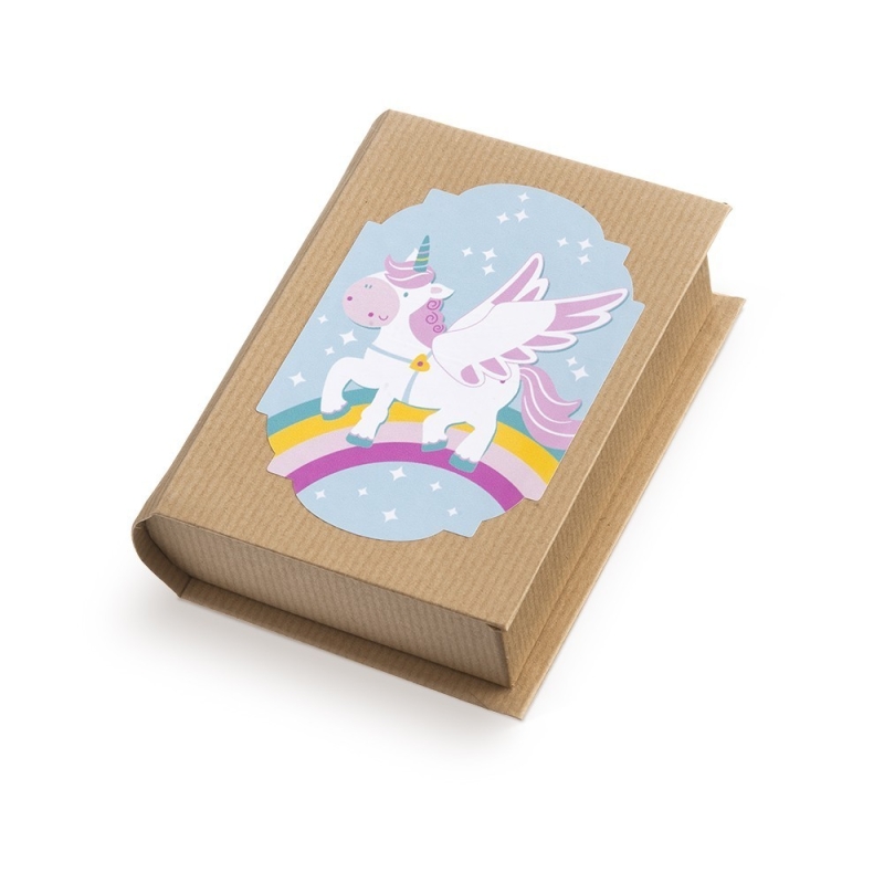 Χάρτινο kraft βιβλιαράκι. Είναι διακοσμημένο με αυτοκόλλητο μονόκερο.