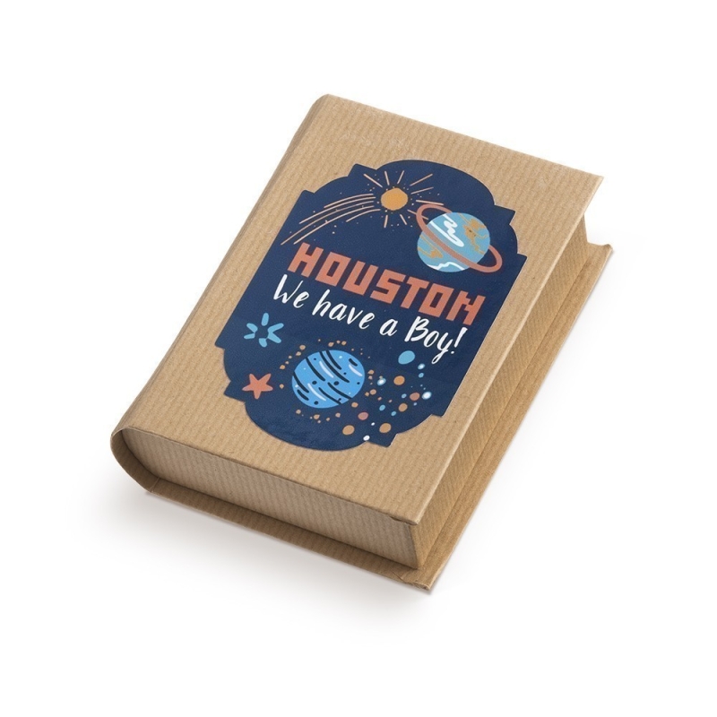 Χάρτινο kraft βιβλιαράκι. Είναι διακοσμημένο με αυτοκόλλητοHouston we have a boy!.