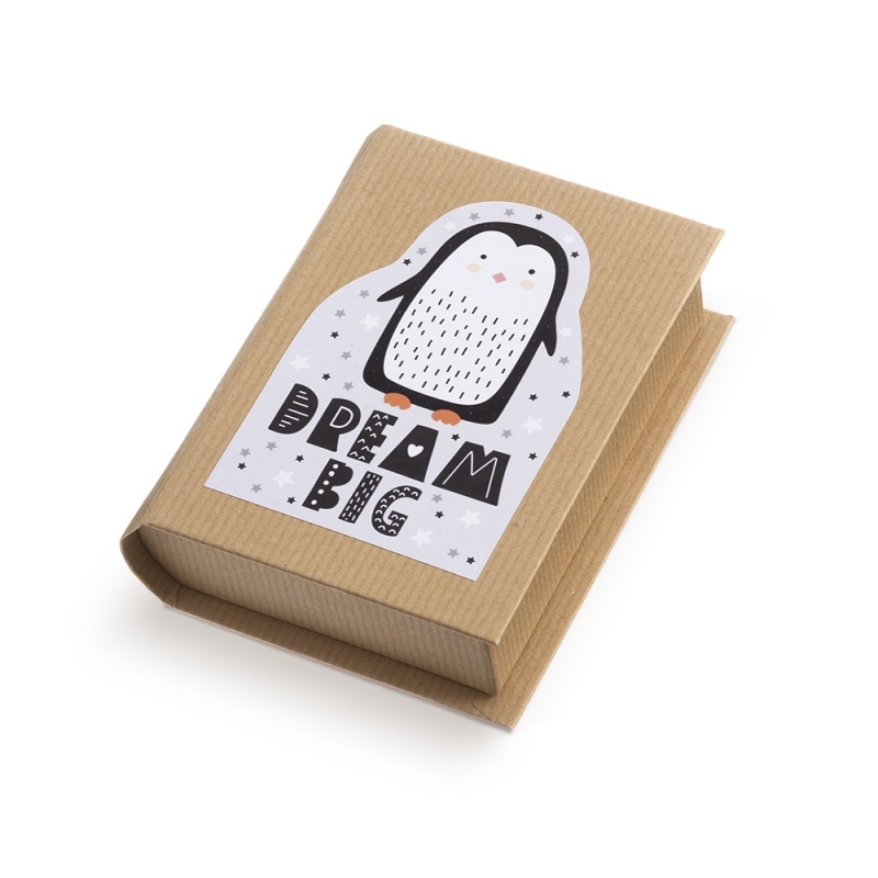 Χάρτινο kraft βιβλιαράκι. Είναι διακοσμημένο με αυτοκόλλητο πιγκουίνο.