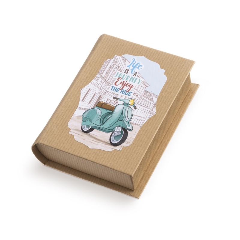 Χάρτινο kraft βιβλιαράκι. Είναι διακοσμημένο με αυτοκόλλητο βέσπα σε βεραμάν απόχρωση.