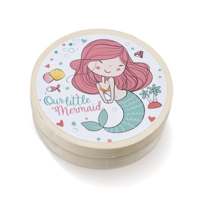 Ξύλινο στρογγυλό κουτάκι .Είναι διακοσμημένο με αυτοκόλλητο γοργόνα .