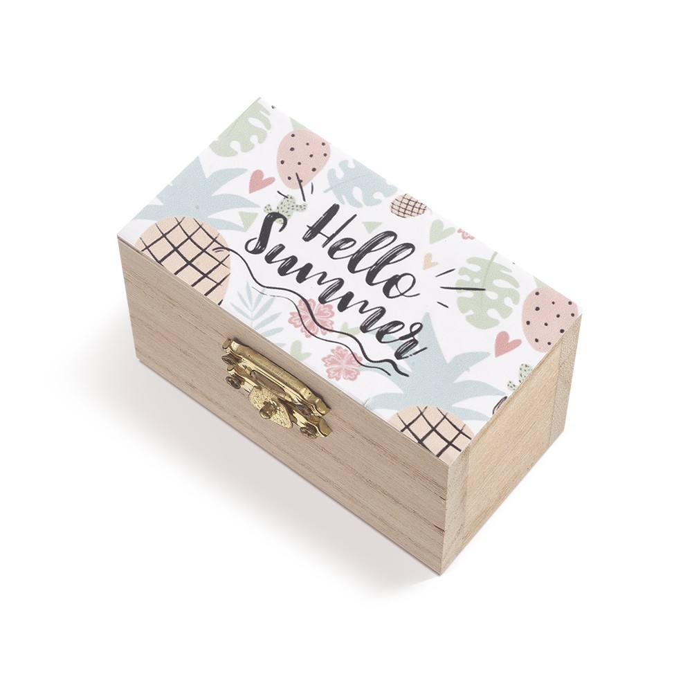 Ξύλινο natural σεντούκι με μεταλλικό κούμπωμα. Είναι διακοσμημένο με αυτοκόλλητο print hello summer.