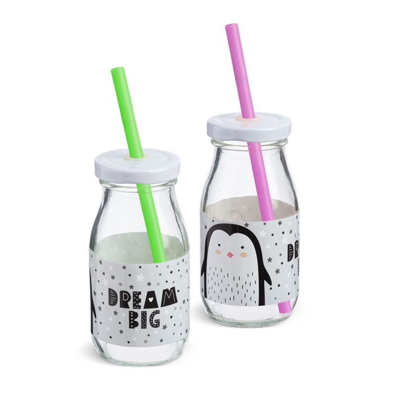 Γυάλινο μπουκάλι γάλακτος 200ml με λευκό μεταλλικό καπάκι. Συνοδεύεται από πολύχρωμα καλαμάκια. Είναι διακοσμημένο με αυτοκόλλητο print πιγκουίνο .
