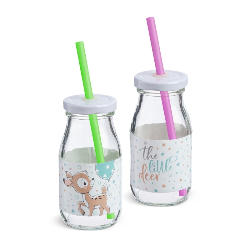 Γυάλινο μπουκάλι γάλακτος 200ml με λευκό μεταλλικό καπάκι. Συνοδεύεται από πολύχρωμα καλαμάκια. Είναι διακοσμημένο με αυτοκόλλητο print ελαφάκι.