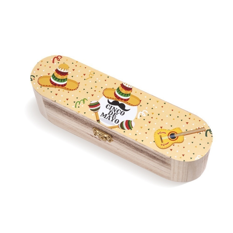 Ξύλινη natural κασετίνα με μεταλλικό κούμπωμα. Είναι διακοσμημένη με αυτοκόλλητο print μεξικάνικη fiesta.