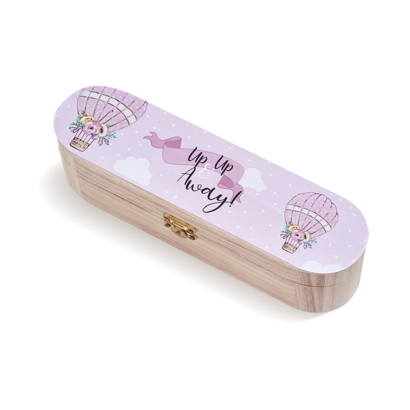 Ξύλινη natural κασετίνα με μεταλλικό κούμπωμα. Είναι διακοσμημένη με αυτοκόλλητο print ροζ αερόστατο.