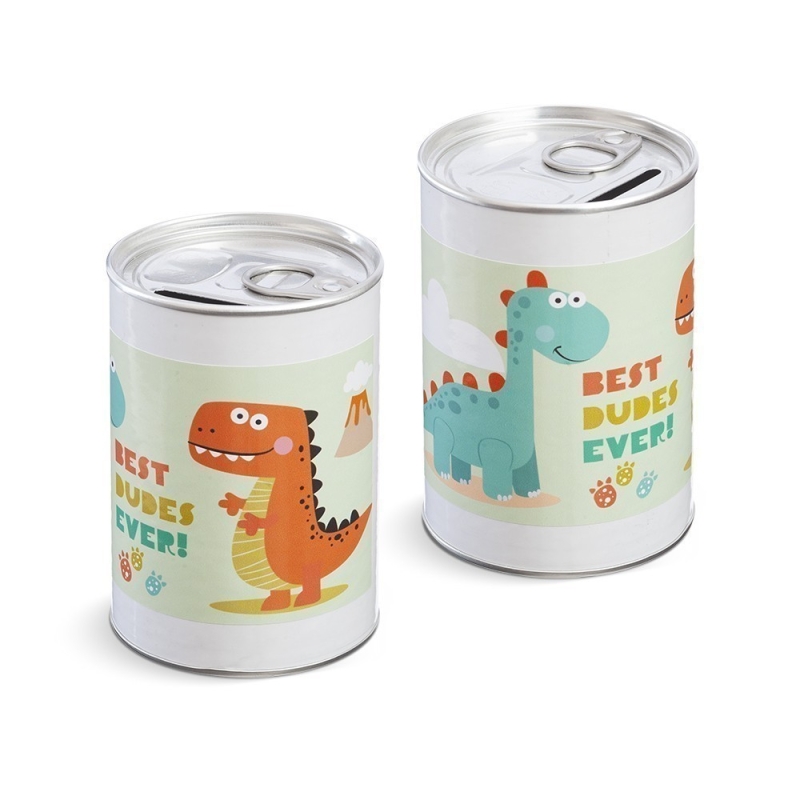 Μεταλλικός κουμπαράς σε σχήμα κονσέρβας. Είναι διακοσμημένο με αυτοκόλλητο print δεινόσαυρο.