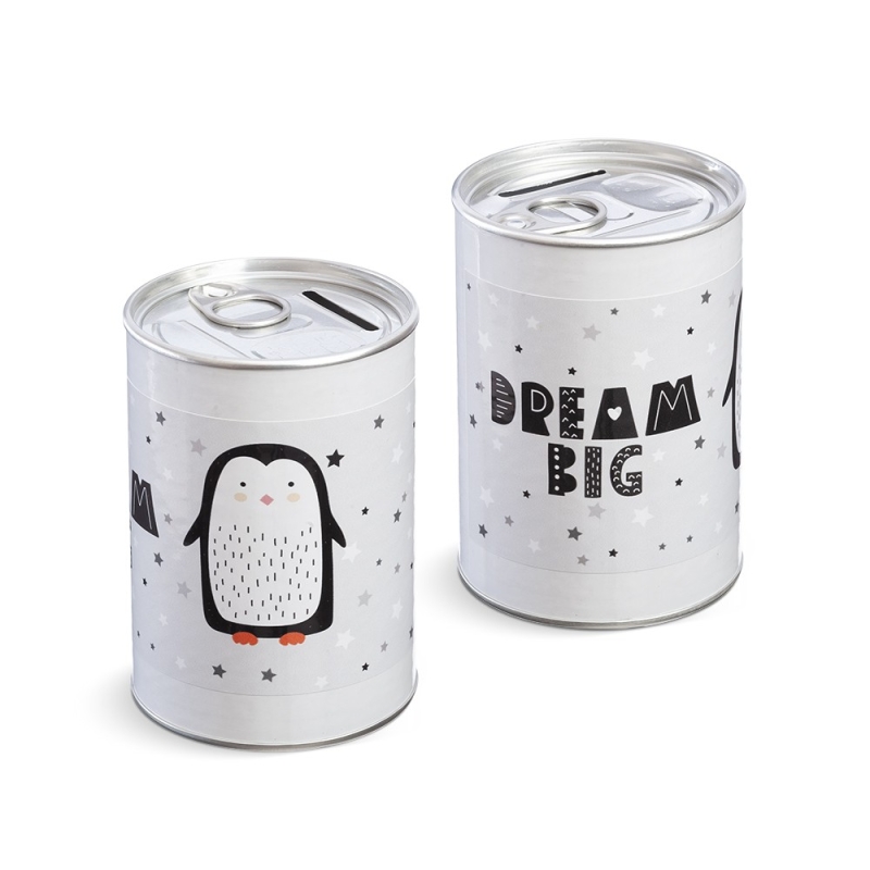 Μεταλλικός κουμπαράς σε σχήμα κονσέρβας. Είναι διακοσμημένο με αυτοκόλλητο print πιγκουίνο.
