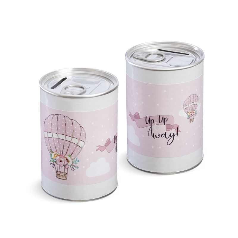 Μεταλλικός κουμπαράς σε σχήμα κονσέρβας. Είναι διακοσμημένο με αυτοκόλλητο print αερόστατο ροζ.