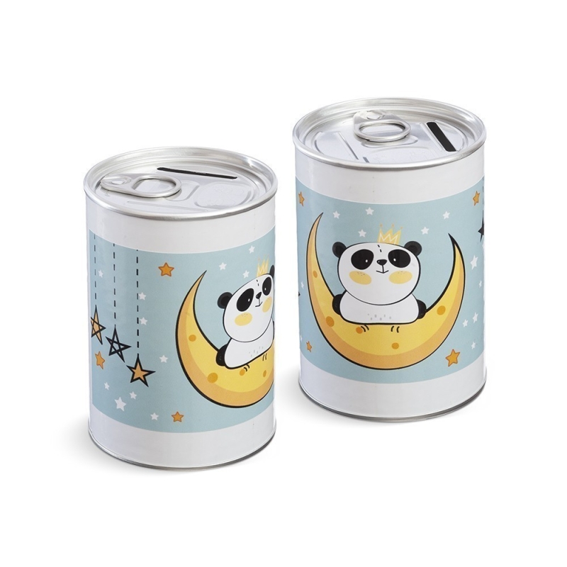 Μεταλλικός κουμπαράς σε σχήμα κονσέρβας. Είναι διακοσμημένο με αυτοκόλλητο print panda.