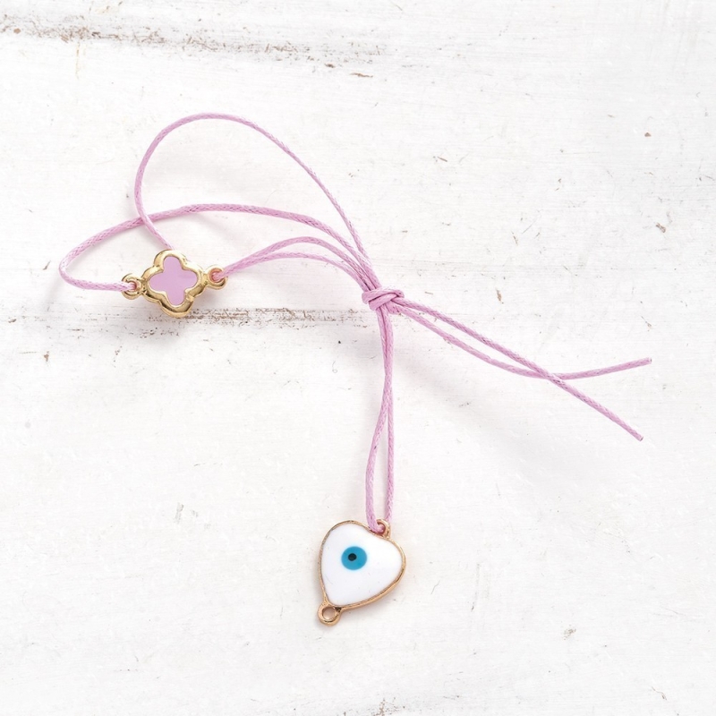 Μαρτυρικό κολιέ με κερωμένο κορδόνι ροζ,επίχρυσο σταυρό ροζ και μάτι σε σχήμα καρδιάς.