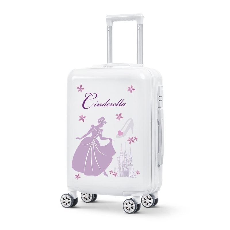 Ζωγραφιστή βαλίτσα trolley για βαπτιστικά σε άσπρο γυαλιστερό χρώμα. Το θέμα της ζωγραφικής είναι η Σταχτοπούτα σε λιλά απόχρωση να στέκεται υποκλινόμενη μπροστά από το κάστρο. Στο πάνω μέρος της βαλίτσας είναι ζωγραφισμένο το όνομά της, Cinderella ανάμεσα σε ροζ λουλούδια.