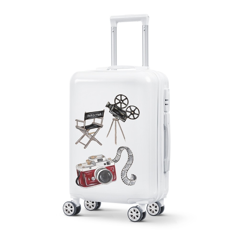 Ζωγραφιστή βαλίτσα trolley για βαπτιστικά σε άσπρο γυαλιστερό χρώμα. Το θέμα της ζωγραφικής είναι ο κινηματογράφος με φωτογραφική μηχανή σε κόκκινη απόχρωση και την καρέκλα του σκηνοθέτη. Η καταλληλότερη επιλογή για τους λάτρεις του κινηματογράφου!