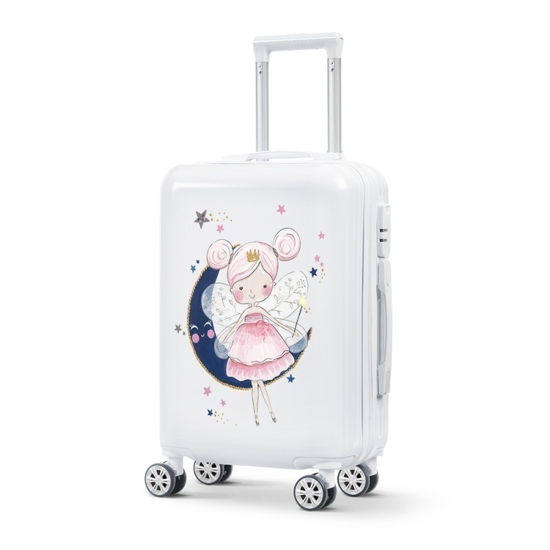 Ζωγραφιστή βαλίτσα trolley για βαπτιστικά σε άσπρο γυαλιστερό χρώμα. Το θέμα της ζωγραφικής είναι Fairy on the moon. Είναι ζωγραφισμένη η νεράιδα που κάθεται πάνω στο φεγγάρι. Τα χρώματα που κυριαρχούν είναι το ροζ και το μπλε navy.