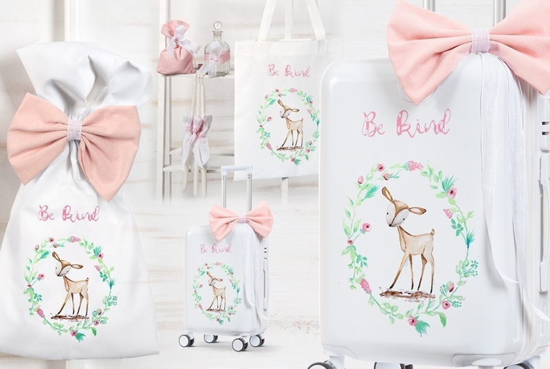 1)Ζωγραφιστή βαλίτσα trolley σε άσπρο γυαλιστερό χρώμα με θέμα το μικρό ελαφάκι και στολισμένη με υφασμάτινο ροζ φιόγκο.