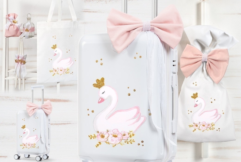 1)Ζωγραφιστή βαλίτσα trolley σε άσπρο γυαλιστερό χρώμα με θέμα τον κύκνο σε λευκές, ροζ και χρυσαφί αποχρώσεις.