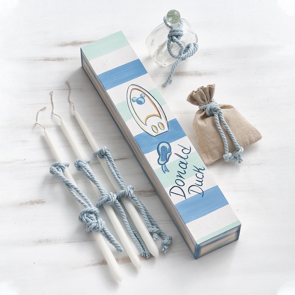 Disney κουτί συσκευασίας παραλληλόγραμμο ζωγραφισμένο στο χέρι με σιέλ και βεραμάν ρίγες. Απεικονίζεται η σανίδα του surf και το καπέλο του Donald. Ο κωδικός περιλαμβάνει τα 3 κεράκια, το σαπούνι μέσα σε πουγκάκι και το μπουκάλι του λαδιού, όλα στολισμένα σε σιέλ αποχρώσεις.