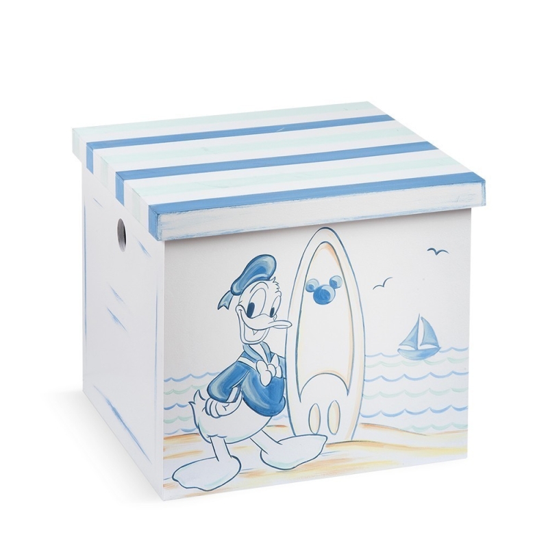 Disney ξύλινος λευκός κύβος με καπάκι, συσκευασία βάπτισης ζωγραφισμένη στο χέρι σε σιέλ αποχρώσεις με καπάκι βαμμένο με σιέλ και βεραμάν ρίγες. Το μπροστινό μέρος του κουτιού είναι ζωγραφισμένο με τον Donald να κρατάει μία σανίδα του surf στην παραλία.
