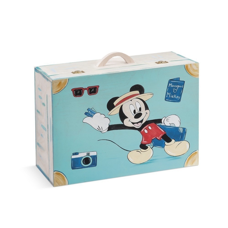 Disney ξύλινη natural βαλίτσα με χερούλι, συσκευασία βάπτισης ζωγραφισμένη στο χέρι με θέμα τον mickey little traveller σε βεραμάν αποχρώσεις. Το πάνω μέρος της βαλίτσας είναι ζωγραφισμένο με τον mickey να κρατάει τη βαλίτσα του και να κάνει σήμα ώτοστοπ περιτριγυρισμένος από τα απαραίτητα αξεσουάρ και έγγραφα ταξιδίου.