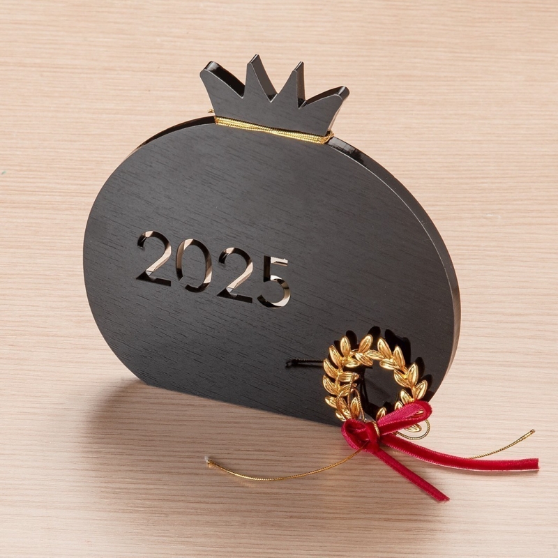 Plexiglass διακοσμητικό οβάλ ρόδι σε μαύρο χρώμα. Στο επιτραπέζιο ρόδι είναι χαραγμένο το "2024" και είναι στολισμένο με μεταλλικό στεφανάκι, χρυσά κορδόνια και κορδέλα βελούδινη σε κόκκινη απόχρωση.