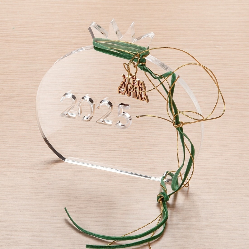 Plexiglass διακοσμητικό οβάλ ρόδι σε διάφανο χρώμα. Στο επιτραπέζιο ρόδι είναι χαραγμένο το "2024" και είναι στολισμένο με μεταλλικό μοτίφ, χρυσά κορδόνια και κορδέλα βελούδινη σε πράσινη απόχρωση.