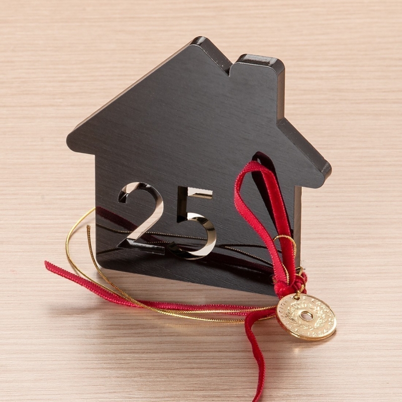 Plexiglass διακοσμητικό σπιτάκι σε μαύρο χρώμα. Στο εσωτερικό είναι χαραγμένο το ''24".To επιτραπέζιο σπιτάκι είναι στολισμένο με μεταλλική δεκάρα, χρυσά κορδόνια και βελούδινη κορδέλα σε κόκκινη απόχρωση.