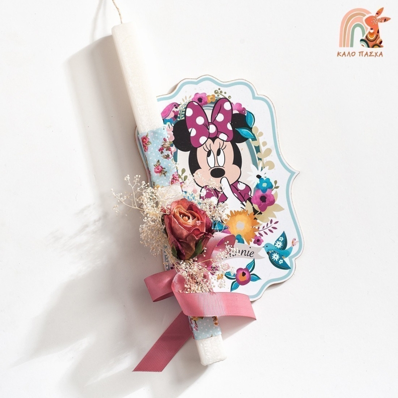 Πασχαλινή λαμπάδα με θέμα την Minnie. Η λαμπάδα είναι διακοσμημένη με λουλούδια και ξύλινη παράσταση Minnie flowers.