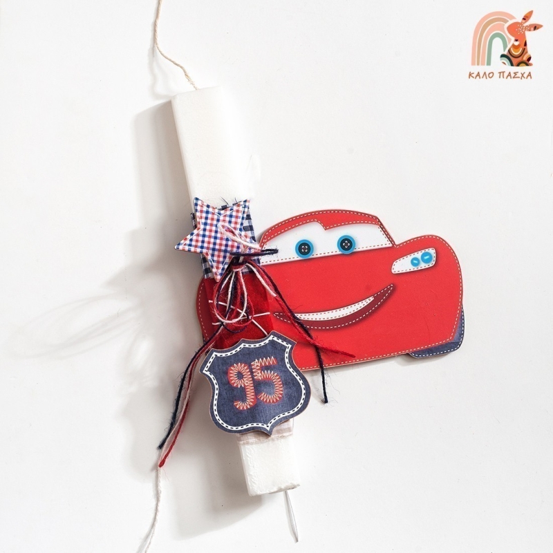 Πασχαλινή λαμπάδα με θέμα McQueen.Η λαμπάδα είναι διακοσμημένη με διάφορα ξύλινα στοιχεία που απεικονίζουν τον Lightning McQueen.