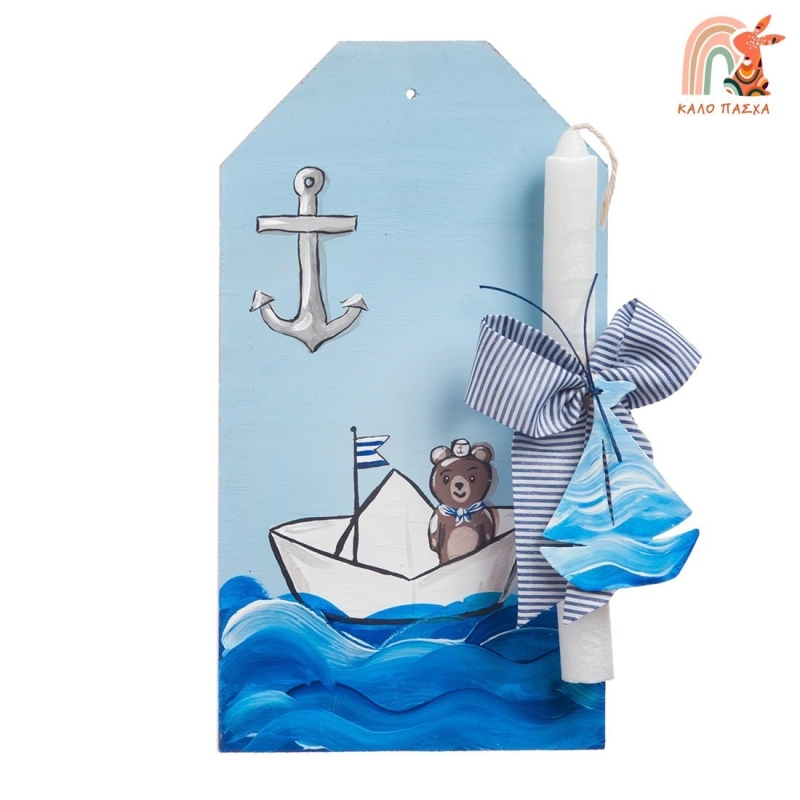 Πασχαλινή λαμπάδα με θέμα Αρκουδάκι ναυτάκι. Η λαμπάδα είναι διακοσμημένη με μεταλλικό ζωγραφιστό καραβάκι και ξύλινη κρεμαστή ετικέτα ζωγραφισμένη με το αρκουδάκι ναύτη.