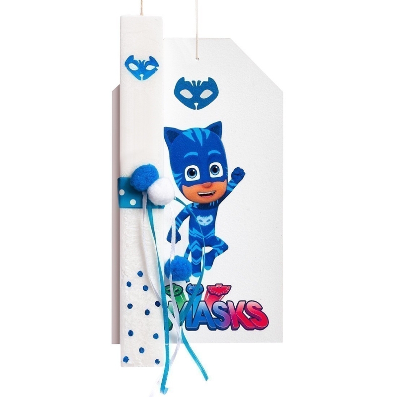 Πασχαλινή λαμπάδα με θέμα τους Pj Masks. H λαμπάδα είναι ζωγραφισμένη στα χρώματα των Pj Masks .Στην ξύλινη ετικέτα απεικονίζεται ο Catboy.