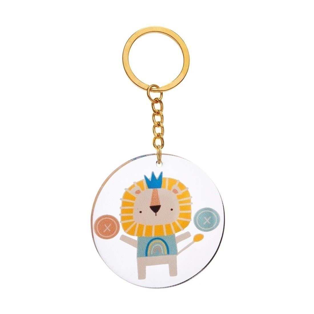 Μπρελόκ με στρογγυλή print παράσταση από plexiglass σε διάφανο χρώμα. Η παράσταση απεικονίζει ένα λιονταράκι σε σιέλ αποχρώσεις.