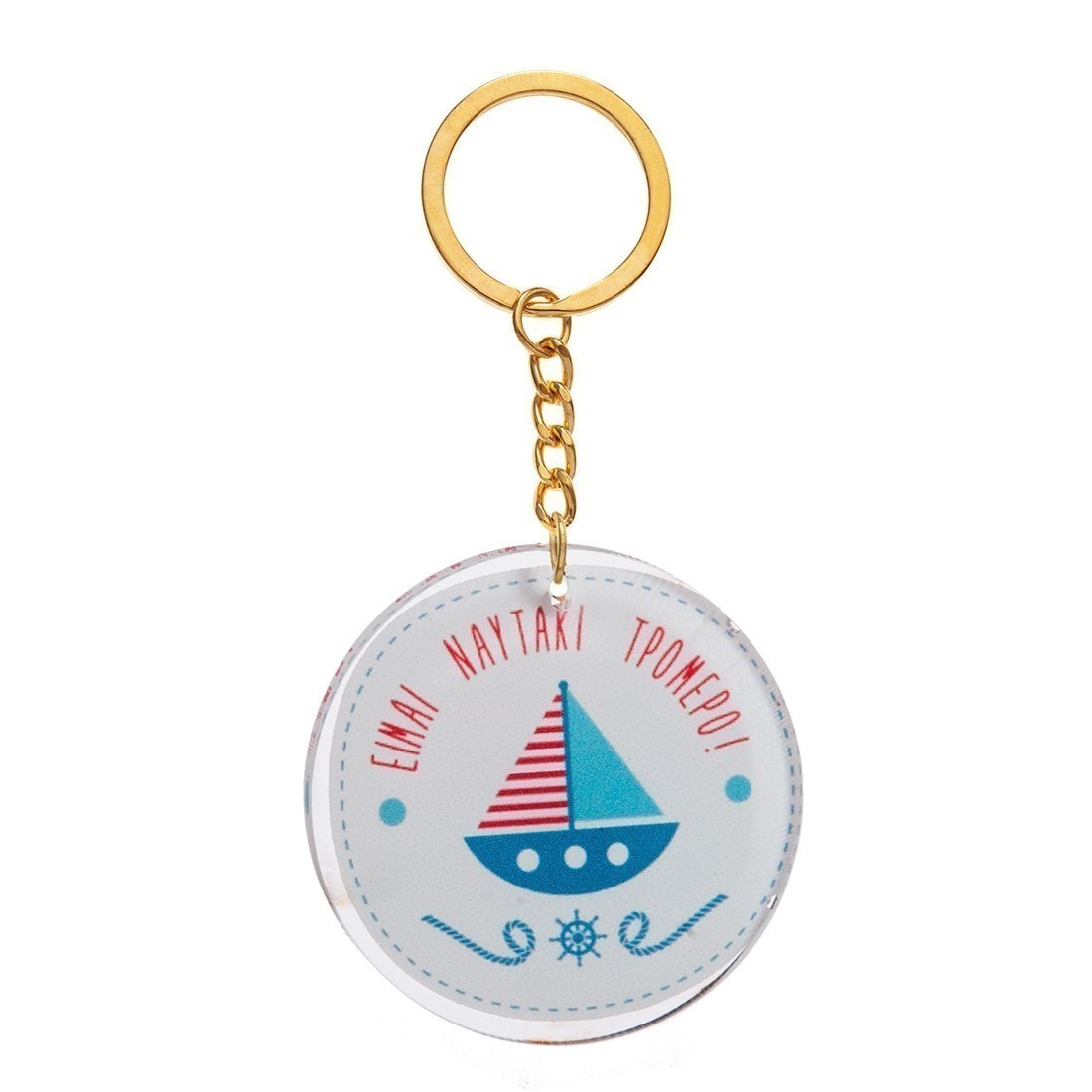 Μπρελόκ με στρογγυλή print παράσταση από plexiglass σε διάφανο χρώμα. Η παράσταση απεικονίζει το κλασσικό ναυτικό θέμα με το καραβάκι και moto "είμαι ναυτάκι τρομερό".