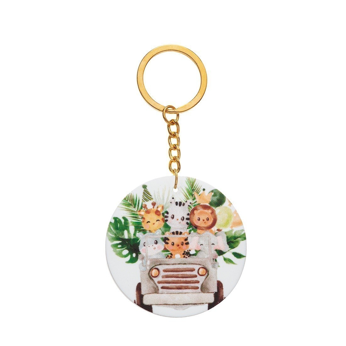 Μπρελόκ με στρογγυλή print παράσταση από plexiglass σε λευκό χρώμα. Η παράσταση απεικονίζει τα ζωάκια της ζούγκλας να πηγαίνουν για safari.