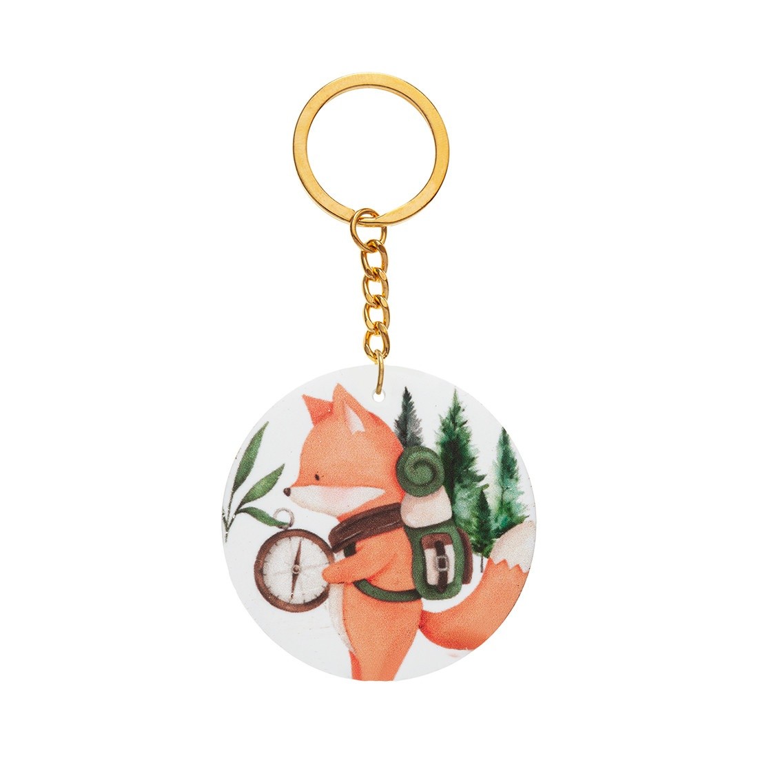 Μπρελόκ με στρογγυλή print παράσταση από plexiglass σε λευκό χρώμα. Η παράσταση απεικονίζει την αλεπού που πηγαίνει camping.
