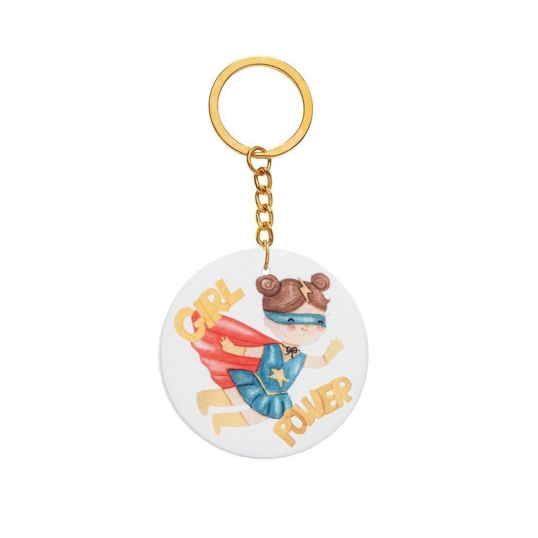 Μπρελόκ με στρογγυλή print παράσταση από plexiglass σε λευκό χρώμα. Η παράσταση απεικονίζει την Super Girl power.