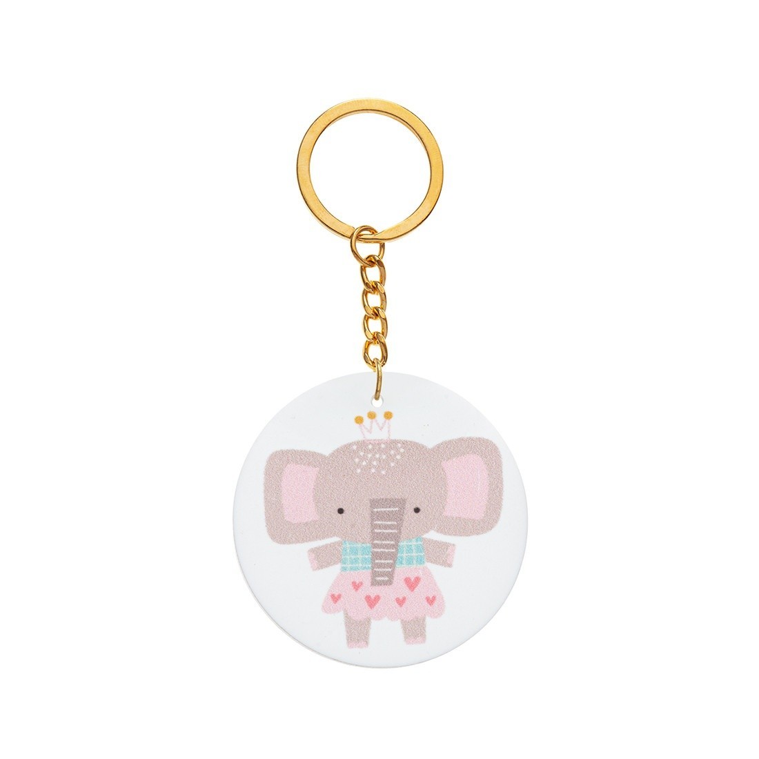 Μπρελόκ με στρογγυλή print παράσταση από plexiglass σε λευκό χρώμα. Η παράσταση απεικονίζει την ελεφαντίνα σε ροζ αποχρώσεις.