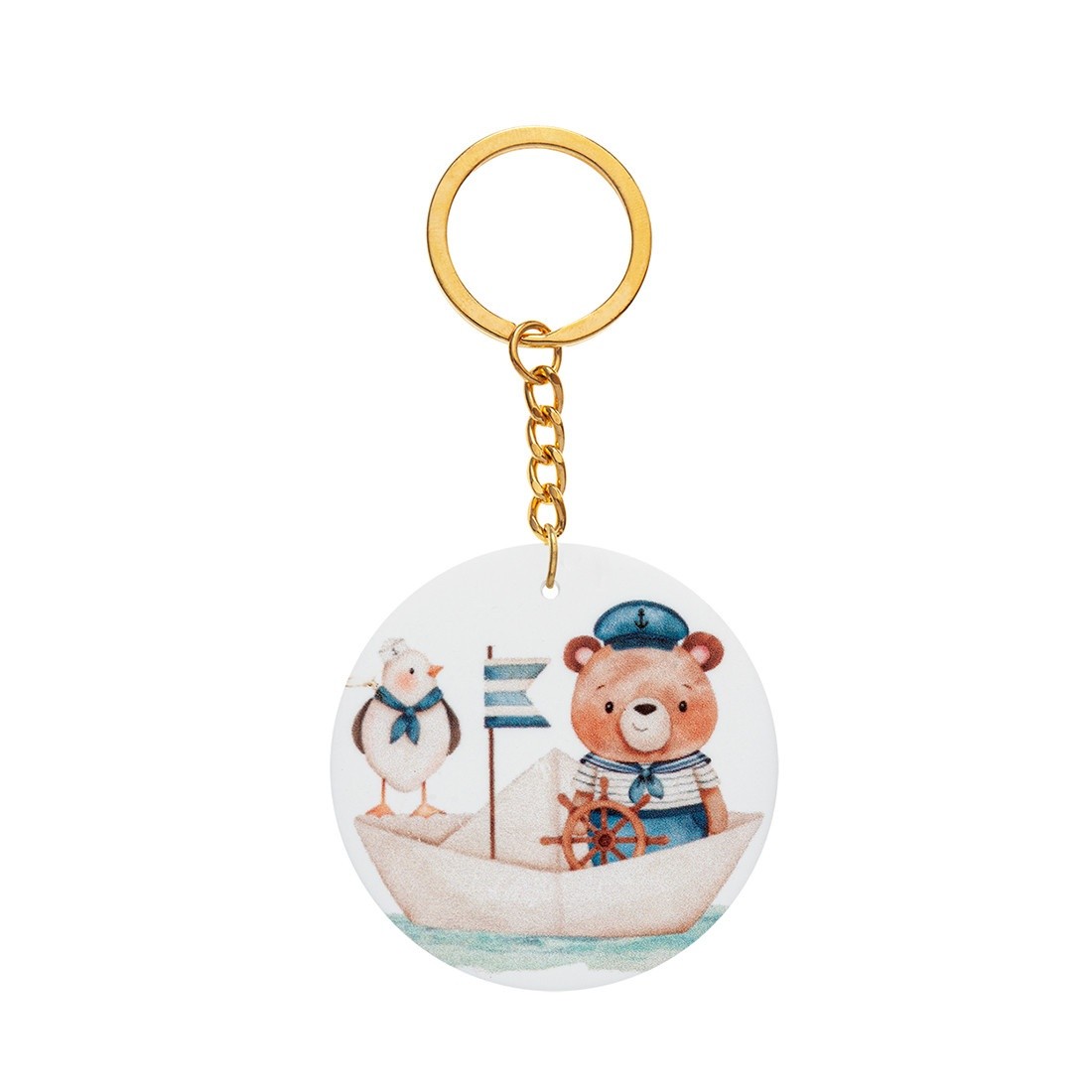 Μπρελόκ με στρογγυλή print παράσταση από plexiglass σε λευκό χρώμα. Η παράσταση απεικονίζει το αρκουδάκι ναυτάκι παρέα με τον γλάρο να αρμενίζουν με τη βαρκούλα τους.