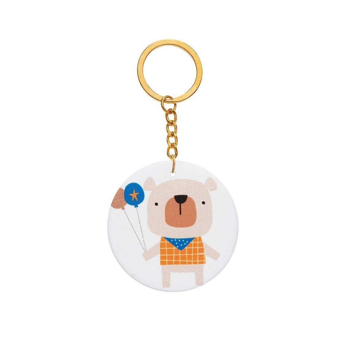Μπρελόκ με στρογγυλή print παράσταση από plexiglass σε λευκό χρώμα. Η παράσταση απεικονίζει το αρκουδάκι να κρατάει μπαλόνια σε σιέλ αποχρώσεις.