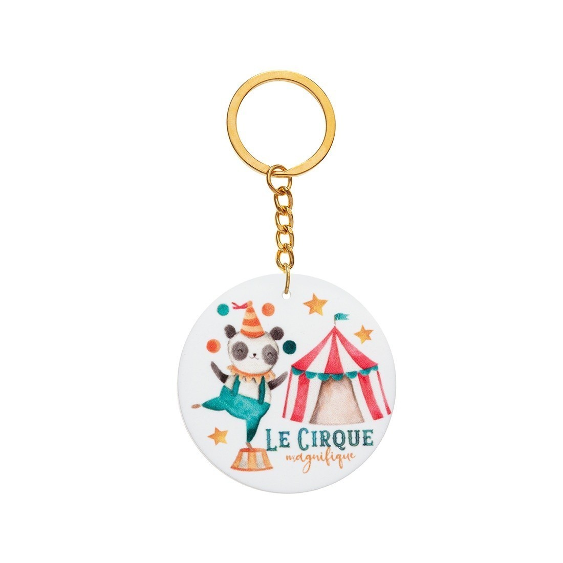 Μπρελόκ με στρογγυλή print παράσταση από plexiglass σε λευκό χρώμα. Η παράσταση απεικονίζει το panda να κάνει ακροβατικά με φόντο τη σκηνή του τσίρκου.